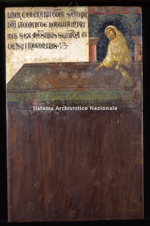 Iscrizione: LIBER CAMERARII COMUNIS SENARUM TENPORE DOMINI IACOPINI DE ROBILLIA, IN PRIMIS SEX MENSIBUS SECUNDA VICE SUI REGIMINISIS